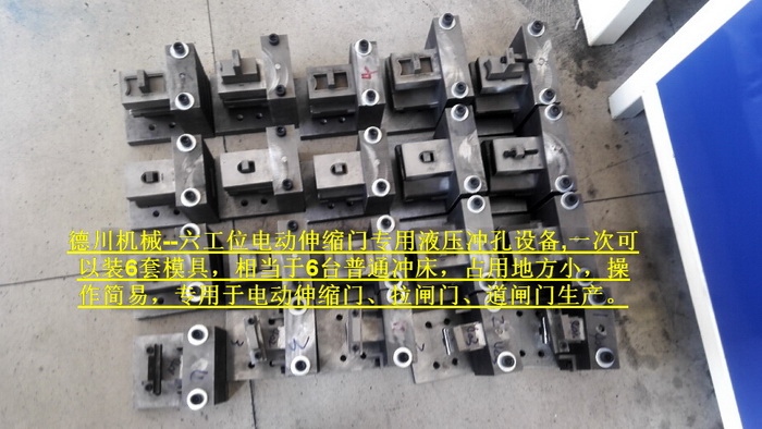 六工位電動伸縮門專用液壓沖孔設備,一次可以裝6套模具,相當于6臺普通沖床,占用地方小,操作簡易,專用于電動伸縮門、拉閘門、道閘門生產。...