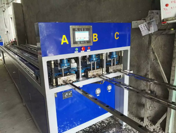 三工位數(shù)控全自動(dòng)沖孔機(jī),漳州用戶使用現(xiàn)場,最多一次沖6支管,每個(gè)油缸可獨(dú)立控制全孔或半孔,一次完成一個(gè)防盜窗沖孔加工,效率更高。